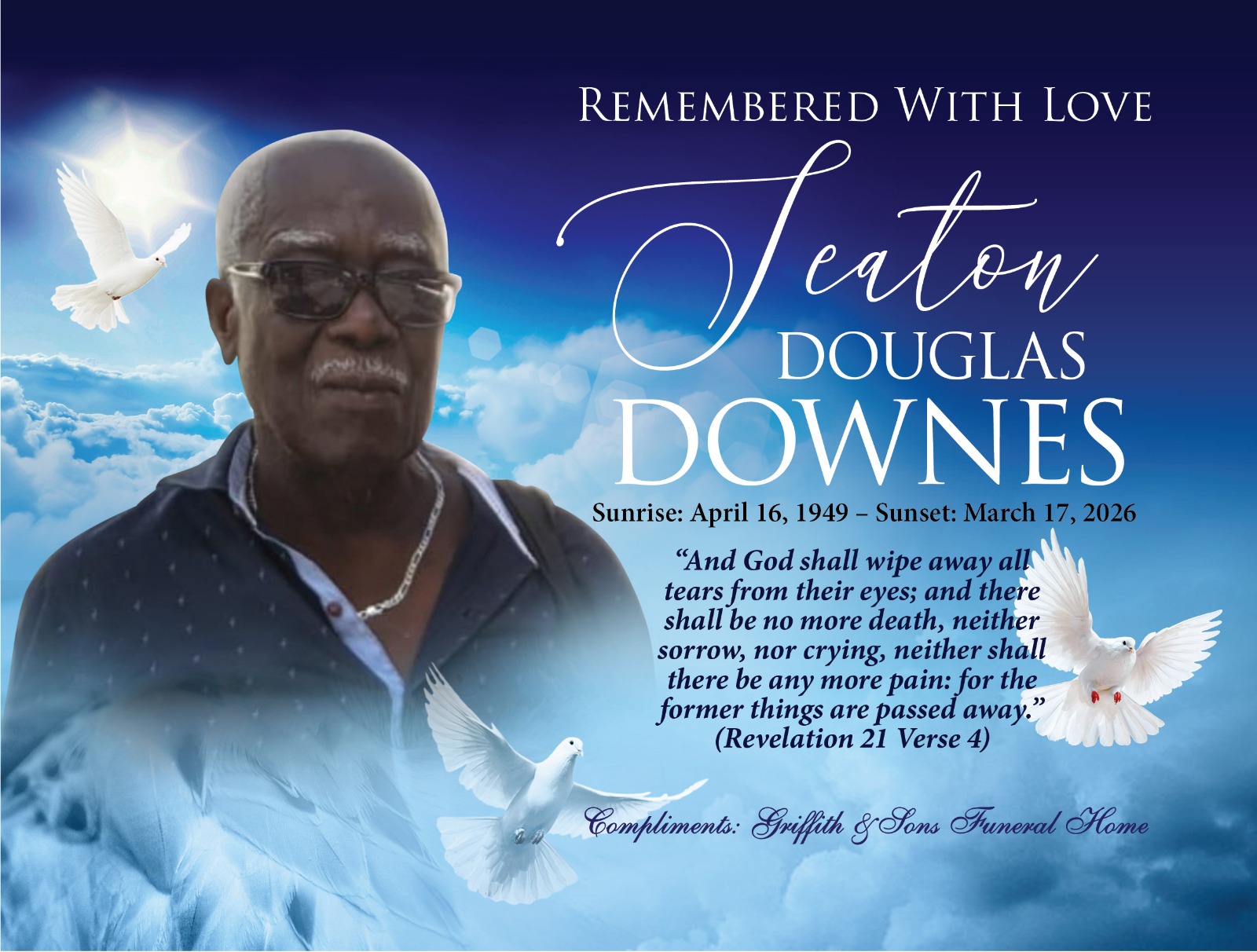The Funeral of the late SEATON DOUGLAS DOWNES takes place on Wednesday April 15th 2026 for the St. Andrew Parish Church at 3:00pm , where relatives and friends are asked to meet for a Thanskgiving Service, followed by the interment in the Churchyard.